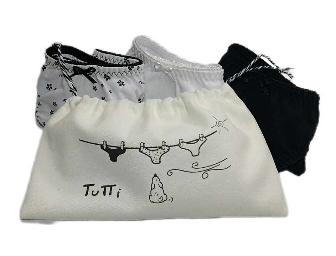 Kit com uma calcinha branca, uma estampada, uma preta e uma necessaire.